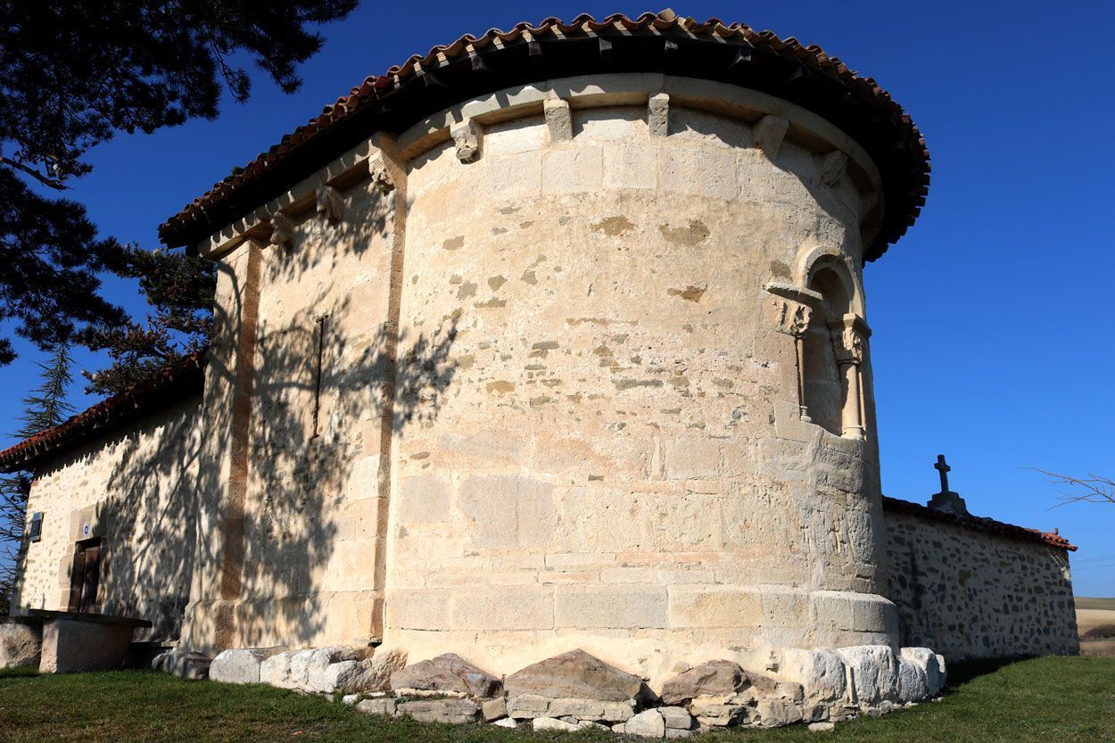 Bisitari adimentsuek Arabako arte erromanikoaren harribitxietako bat aurkituko du kanpoaldean: teilatu-hegaleko harburu apainduak, XII. mendeko eguneroko eszenak irudikatzen dituzten eskultura txikiak musikariak zanfoña bat eta arku-biola bat jotzen, gerlari bat ezpata eta armarriarekin, animaliak eta irudi geometrikoak. Taila horiek adierazkortasun harrigarria dute, eta Lautadako Erdi Aroko bizimoduari buruzko lekukotza baliotsua ematen dute.